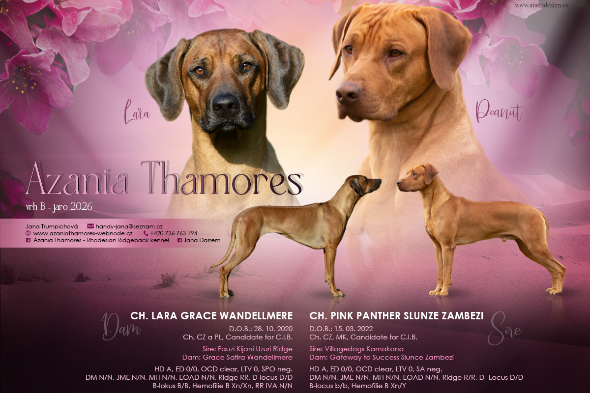 ![]() | M: Lara Grace Wandellmere O: Pink Panther Slunce Zambezi Termín porodu: 6. 3. 2026 Počet štěňát: 9 (3/6) | Azania Thamores Jana Trumpichová Tel.: 736 763 194 handy-jana@seznam.cz https://azaniathamores.webnode.cz/ |