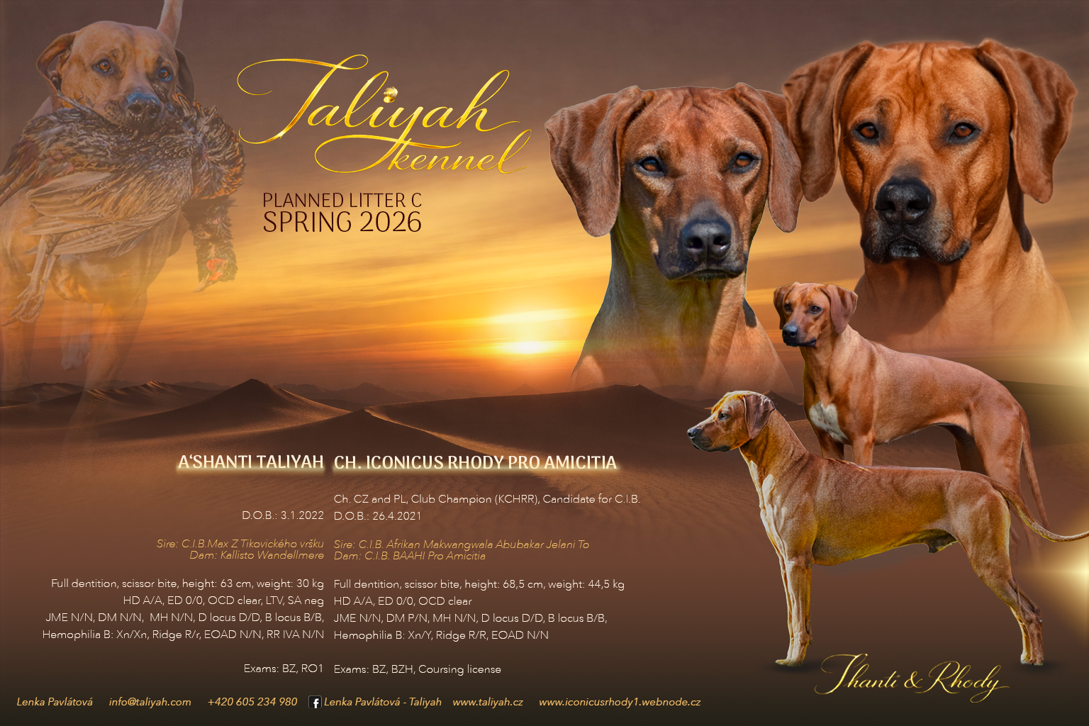 ![]() | M: A´Shanti Taliyah O: Iconicus Rhody Pro Amicitia Předpokládaný termín porodu: 1. 4. 2026 | TALIYAH Lenka Pavlátová Tel: 605 234 980 info@taliyah.cz http://www.taliyah.cz |