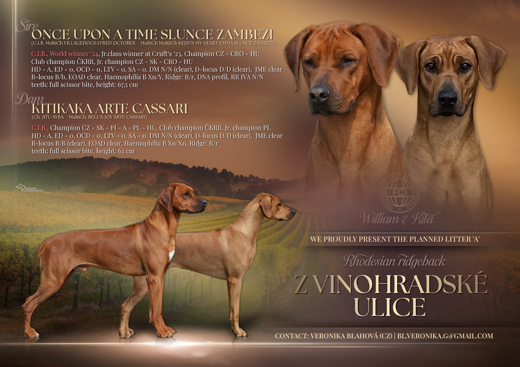 ![]() | M: Kitikaka Arte Cassari O: Once Upon a Time Slunce Zambezi Termín porodu: 15. 1. 2026 Počet štěňat: 12 (6/6) | Z Vinohradské ulice Veronika Blahová Tel.: 776 251 062 bl.veronika.g@gmail.com |