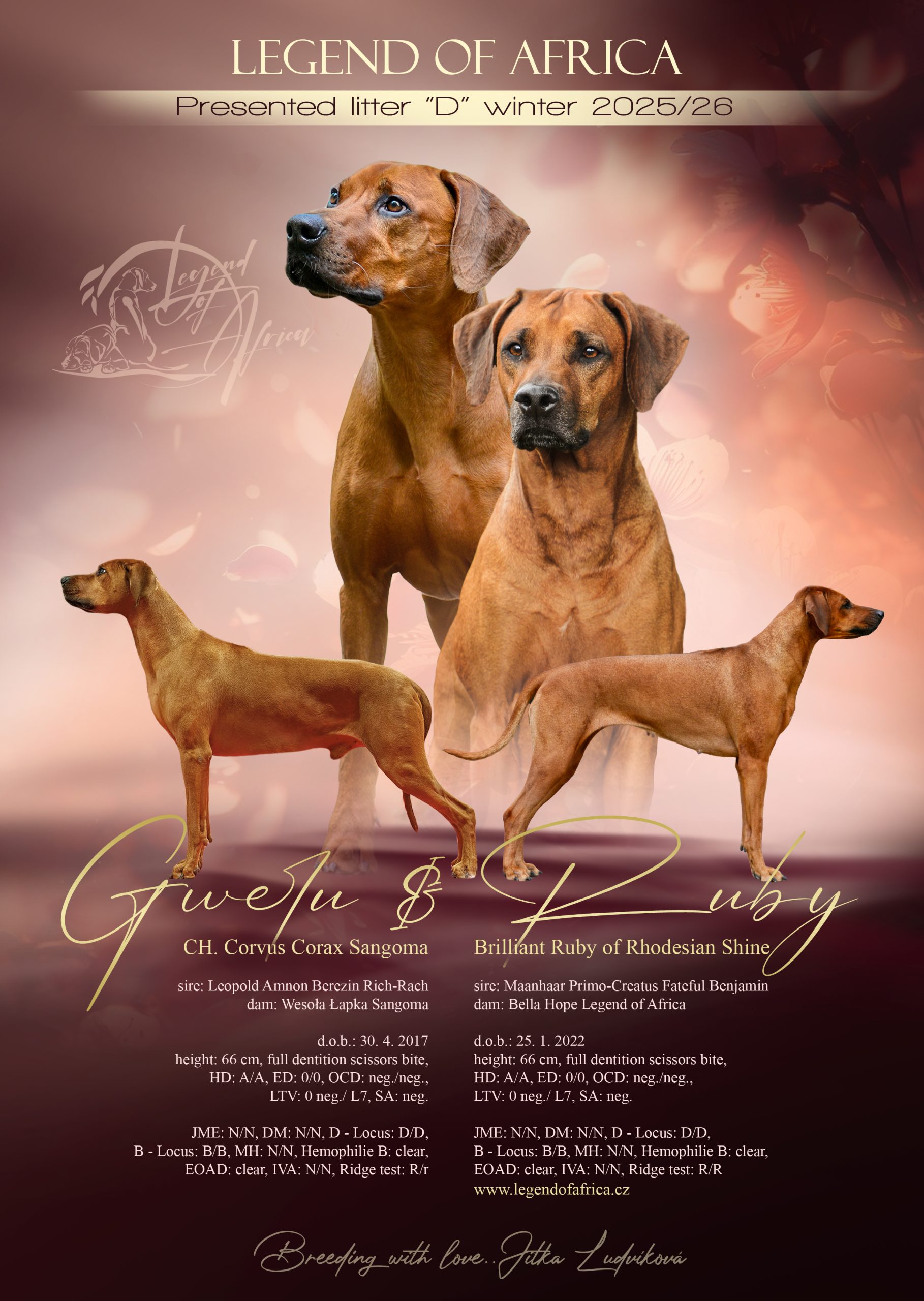![]() | M: Brilliant Ruby of Rhodesian Shine O: Corvus Corax Sangoma Předpokládaný termín porodu: 25. 1. 2026 | Legend of Africa Jitka Ludvíková Tel.: 774 734 526 legendofafrica@seznam.cz https://www.legendofafrica.cz/ |