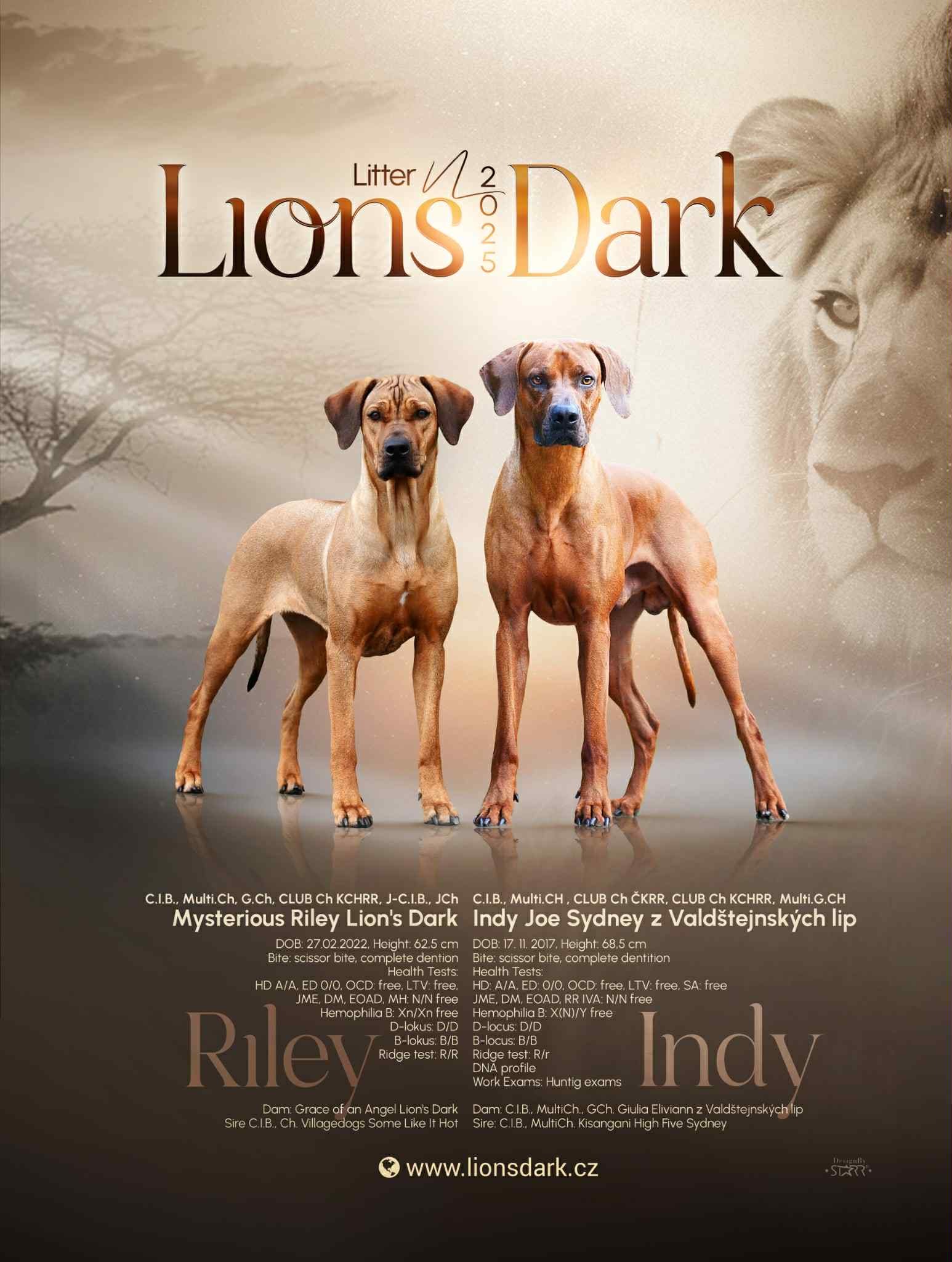 ![]() | M: Mysterious Riley Lion's Dark O: Indy Joe Sydney z Valdštejnských lip Termín porodu: 16. 1. 2026 Počet štěňat: 5 (3/2) | Lion's Dark Lucie Součková Tel.: 775 932 938 luckachaitali@seznam.cz www.lionsdark.cz |