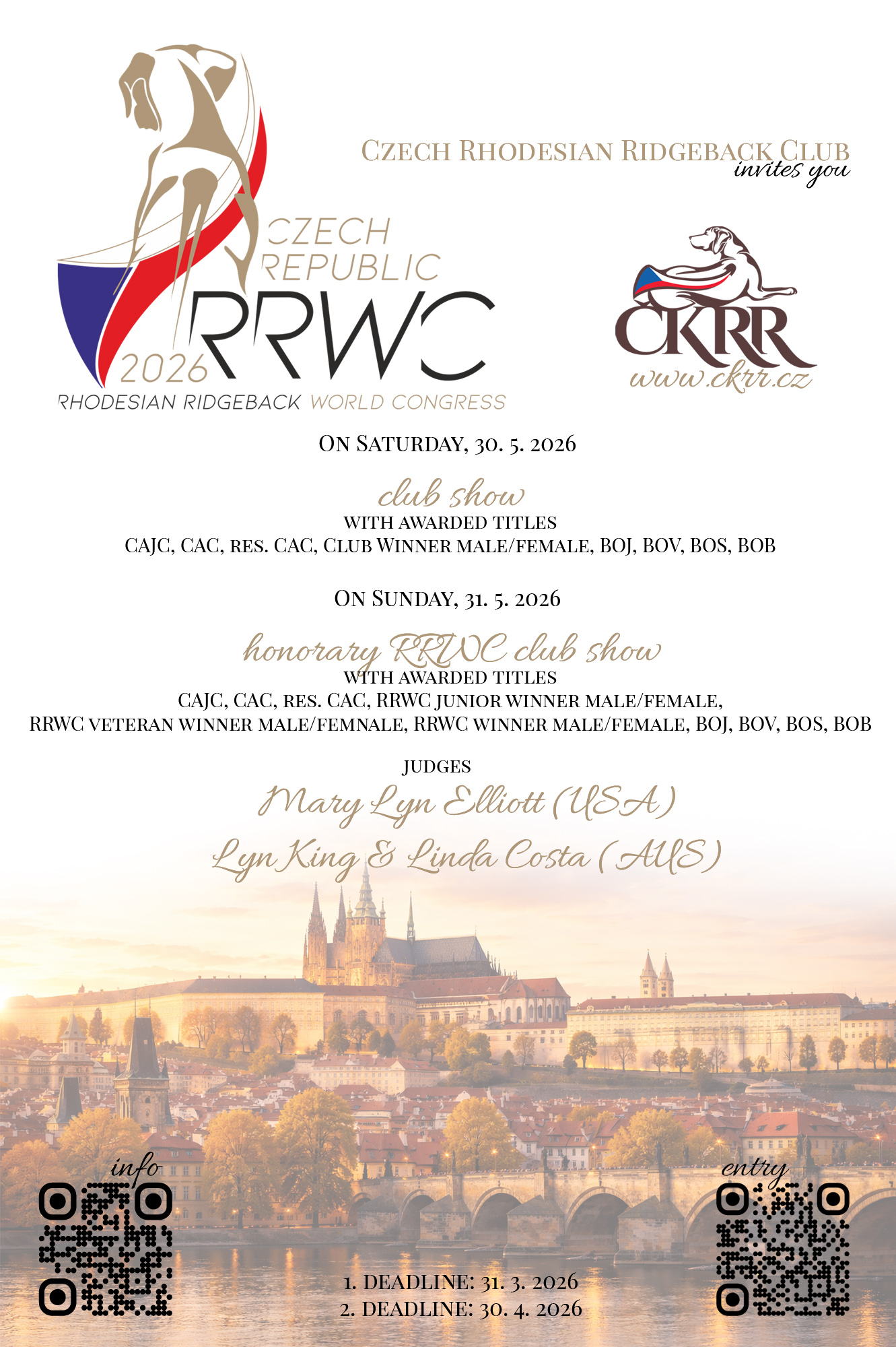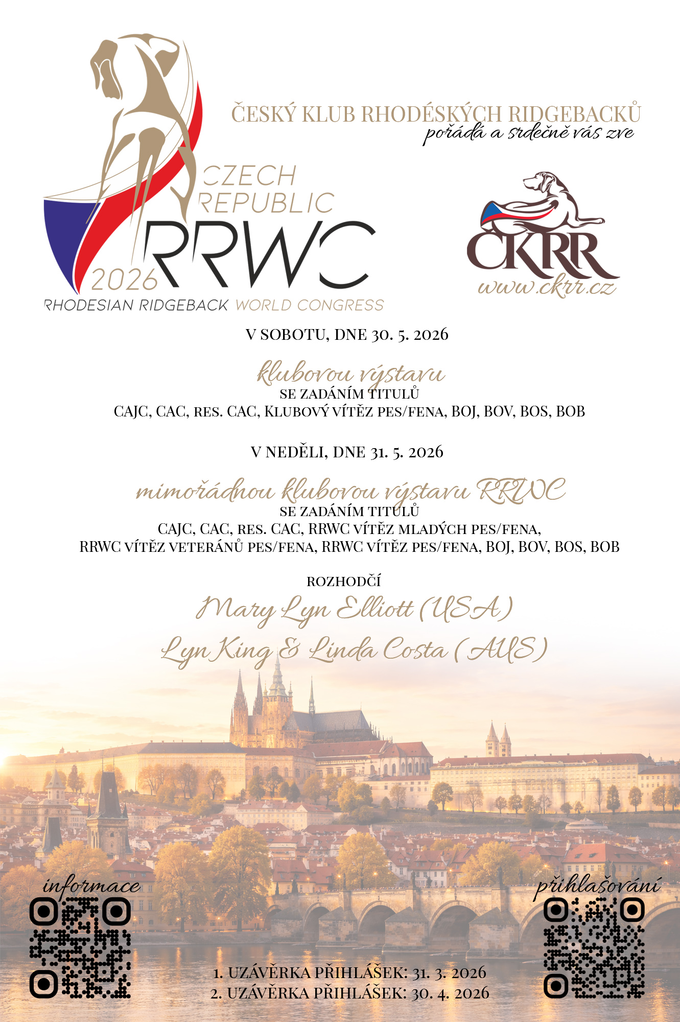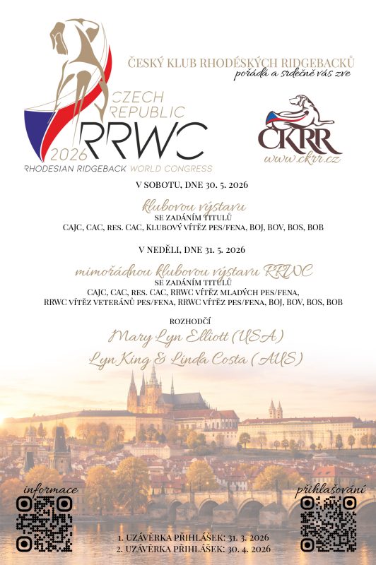 se zadáváním titulů CAJC, CAC, res. CAC, RRWC vítěz mladých pes/fena, RRWC vítěz veteránů pes/fena, RRWC vítěz pes/fena, BOJ, BOV, BOS, BOB
